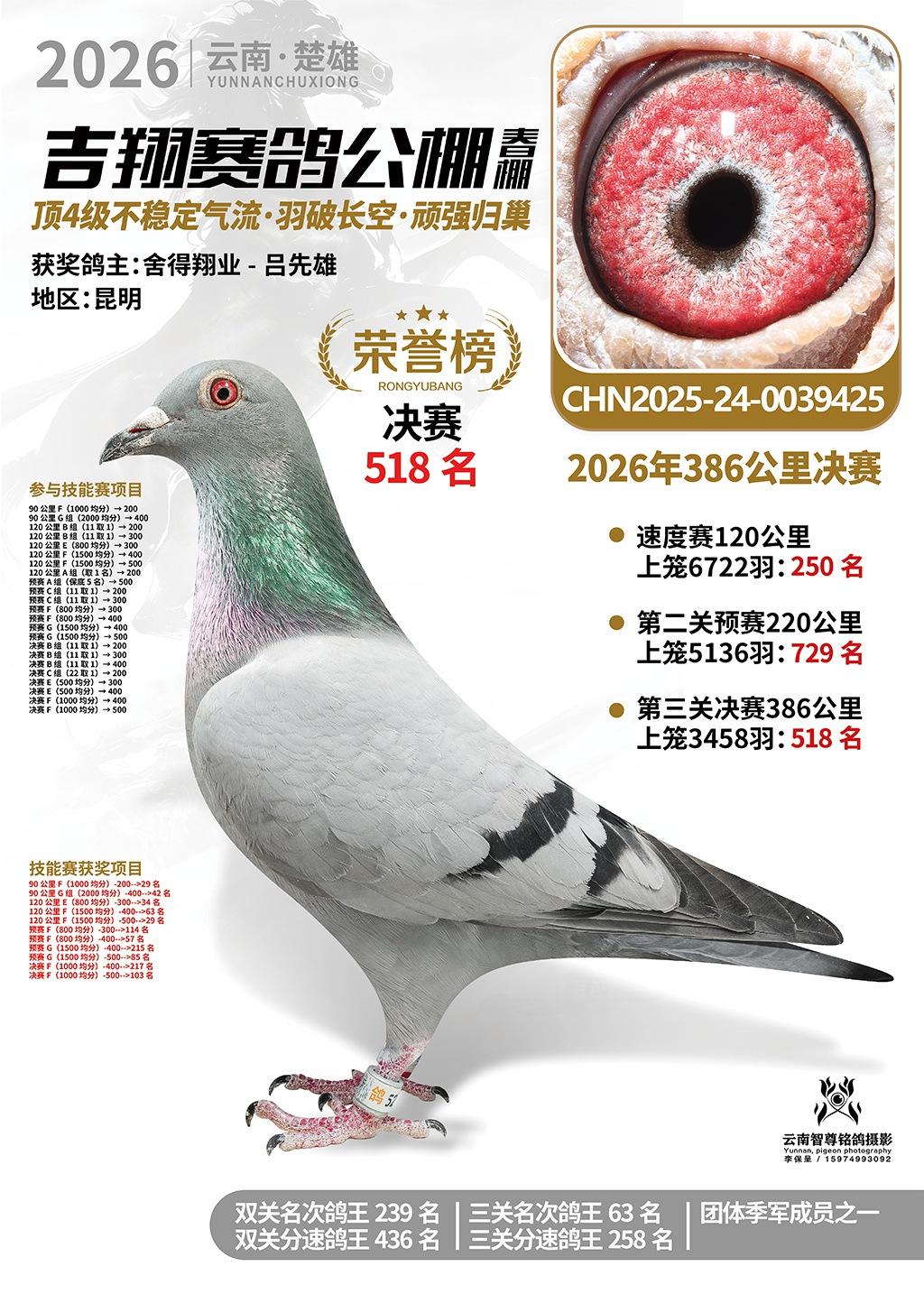 楚雄吉翔公棚(春棚)2026年386公里决赛获奖鸽欣赏