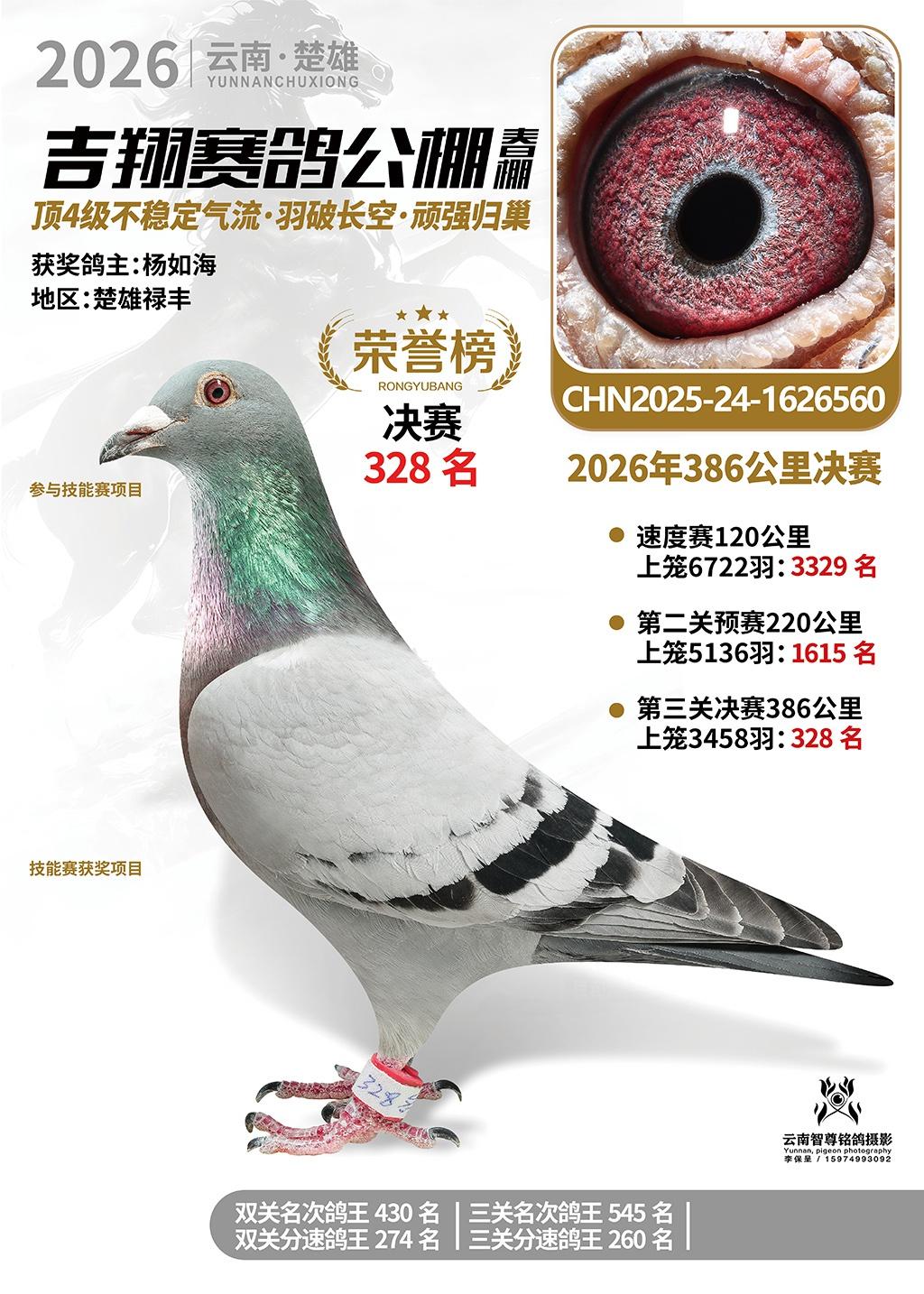 楚雄吉翔公棚(春棚)2026年386公里决赛获奖鸽欣赏