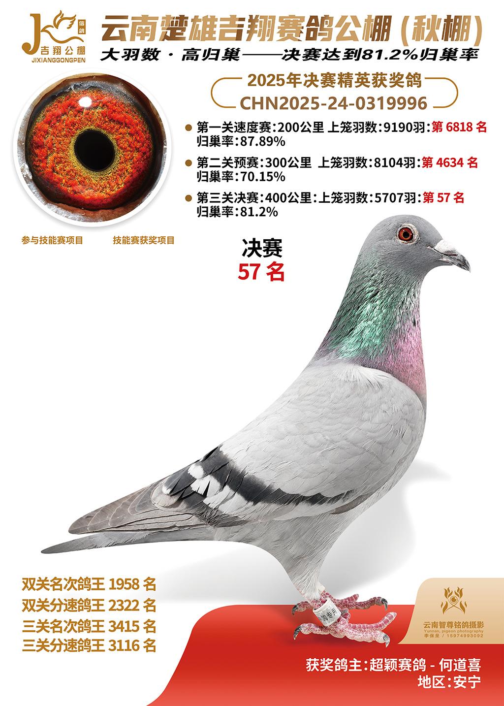 | 鸽主姓名 | 超颖赛鸽-何道喜 |