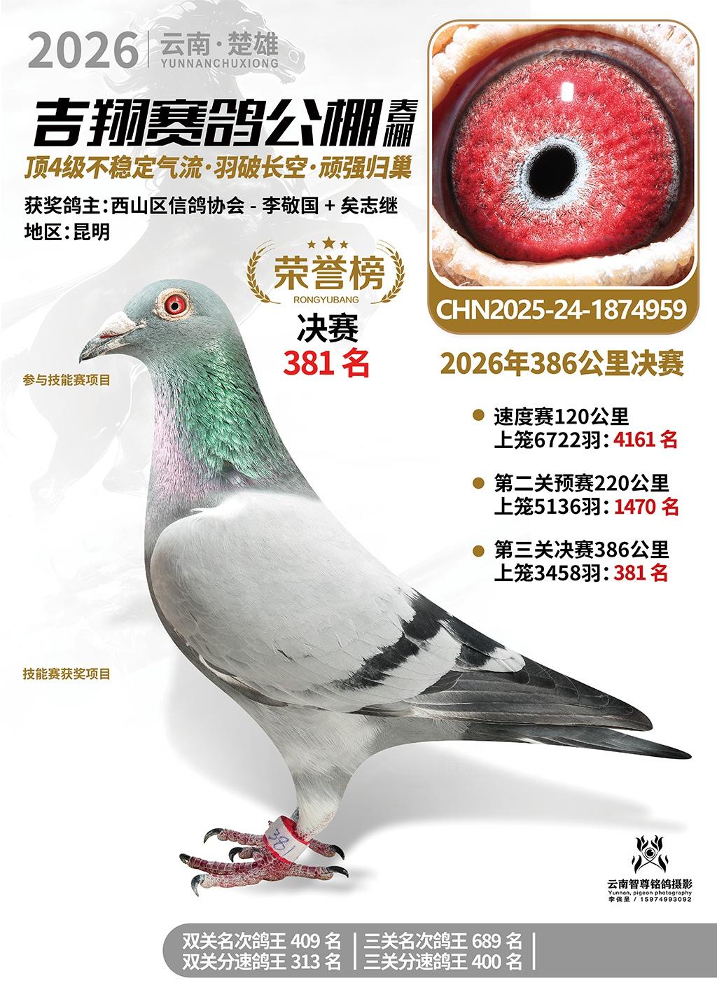 楚雄吉翔公棚(春棚)2026年386公里决赛获奖鸽欣赏