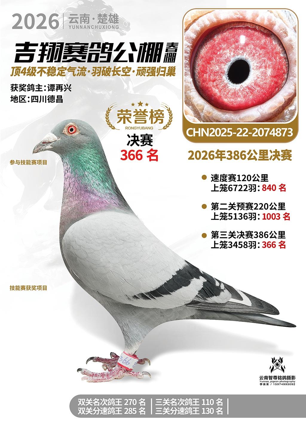 楚雄吉翔公棚(春棚)2026年386公里决赛获奖鸽欣赏