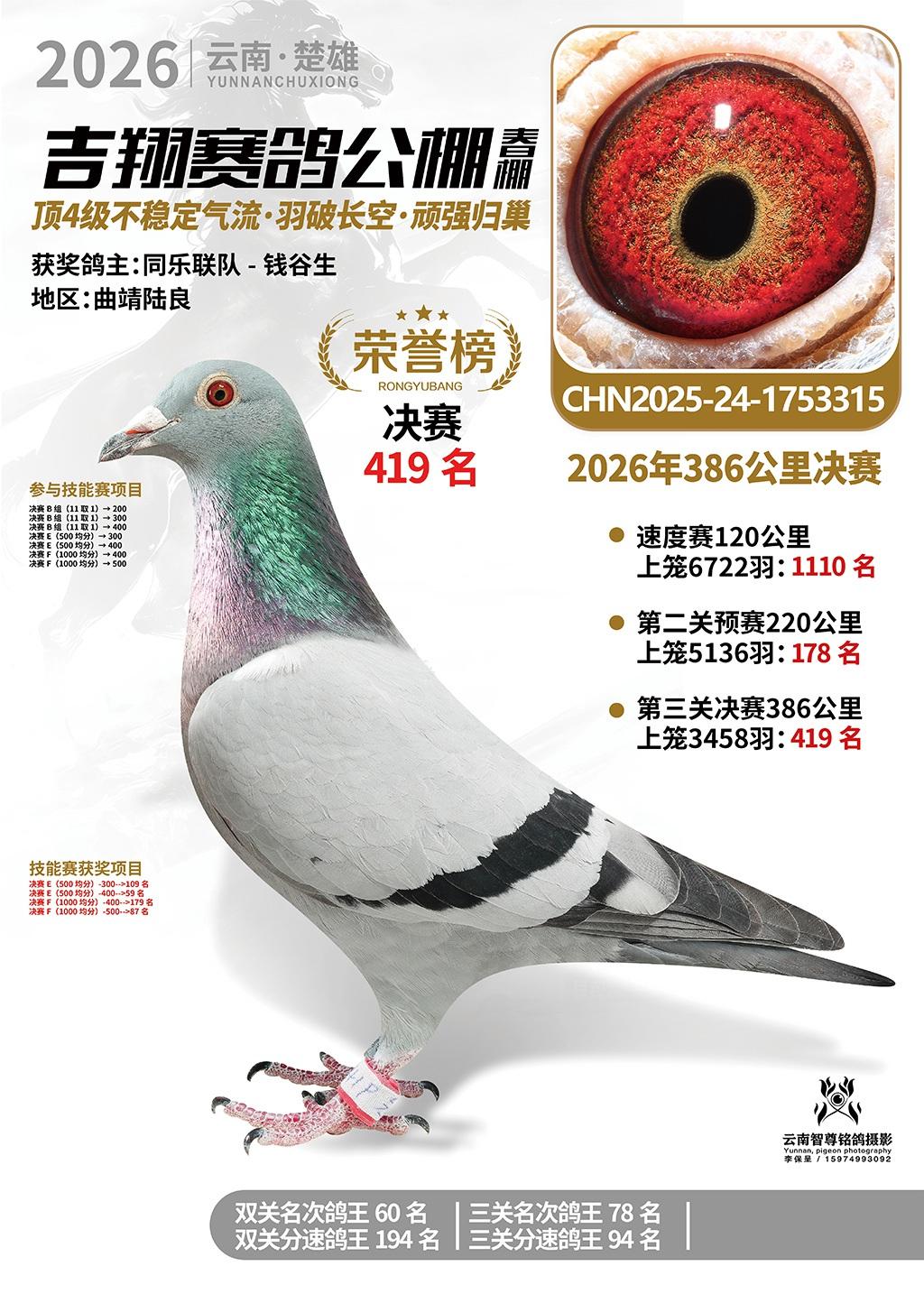 楚雄吉翔公棚(春棚)2026年386公里决赛获奖鸽欣赏