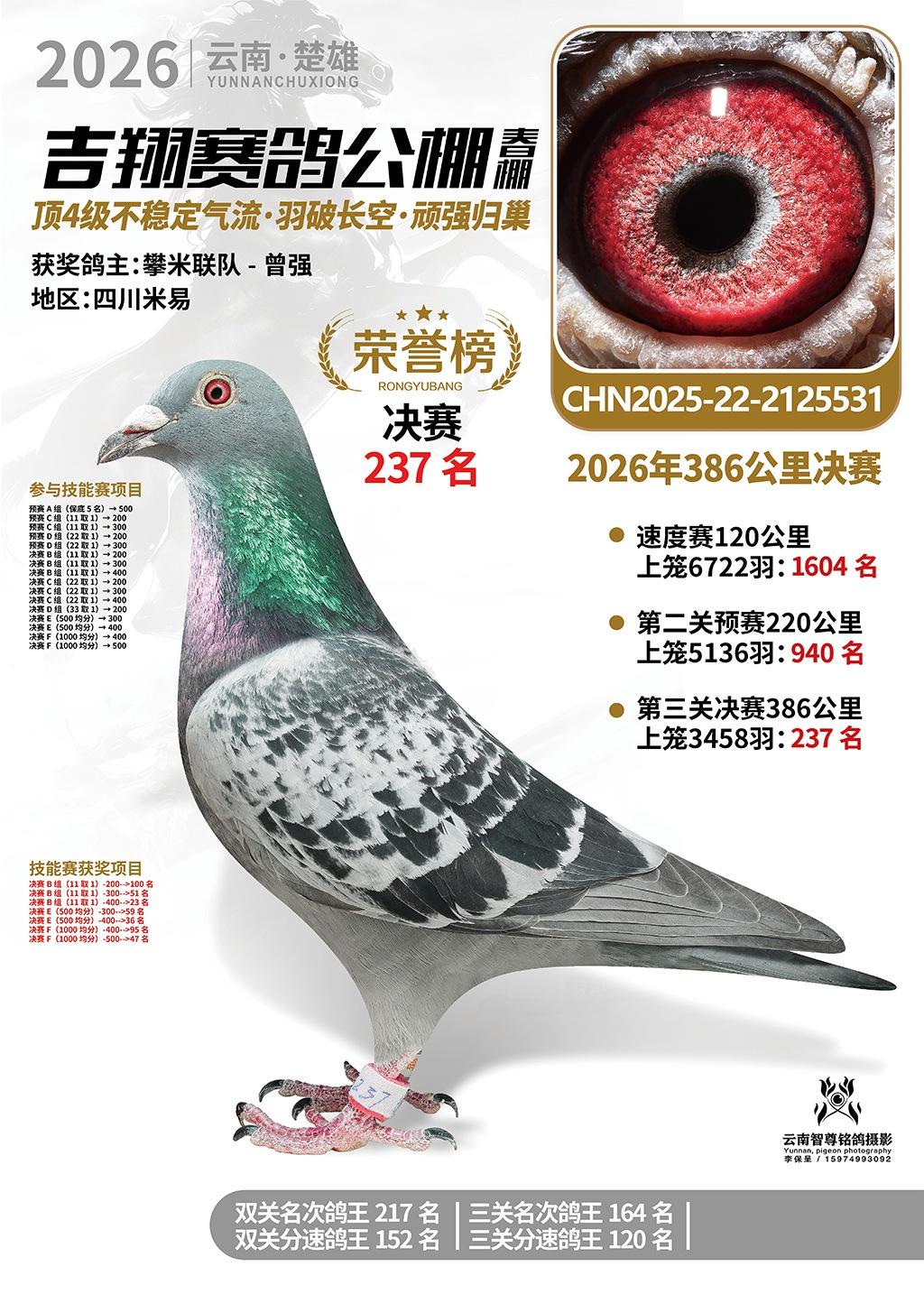楚雄吉翔公棚(春棚)2026年386公里决赛获奖鸽欣赏