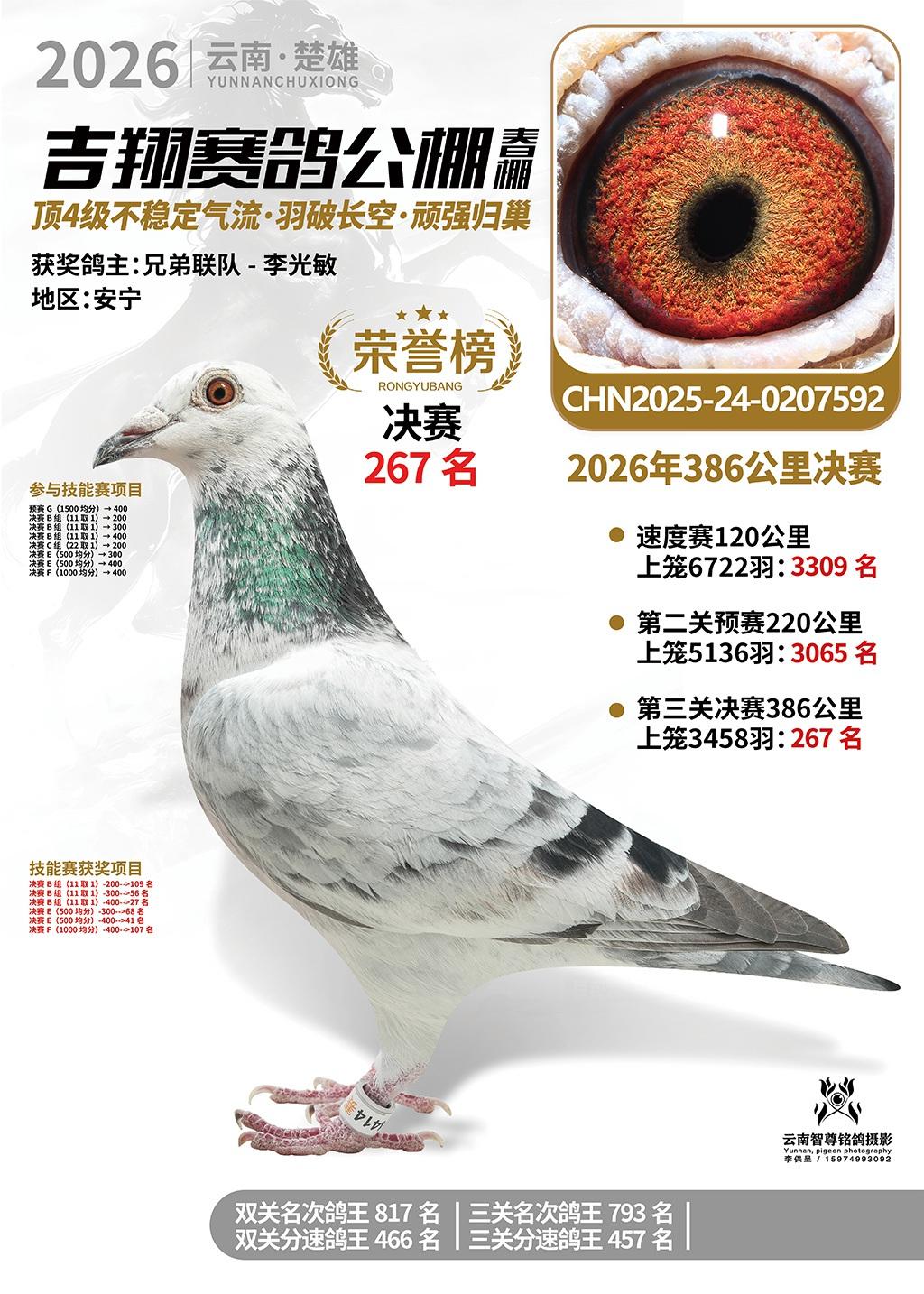 楚雄吉翔公棚(春棚)2026年386公里决赛获奖鸽欣赏
