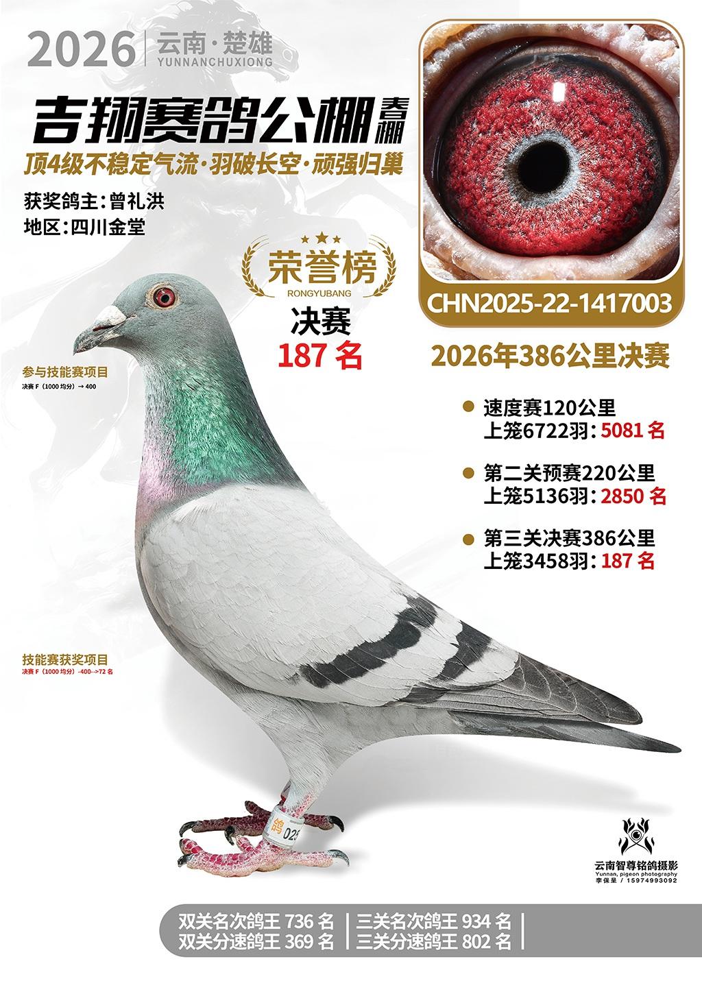 楚雄吉翔公棚(春棚)2026年386公里决赛获奖鸽欣赏