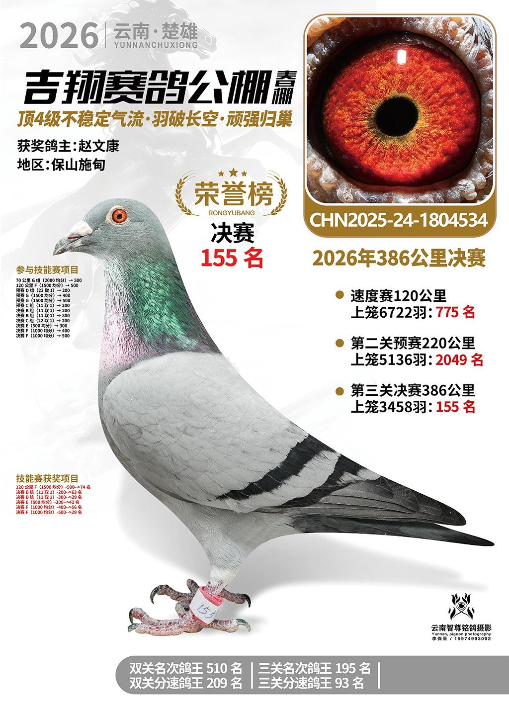 楚雄吉翔公棚(春棚)2026年386公里决赛获奖鸽欣赏